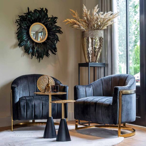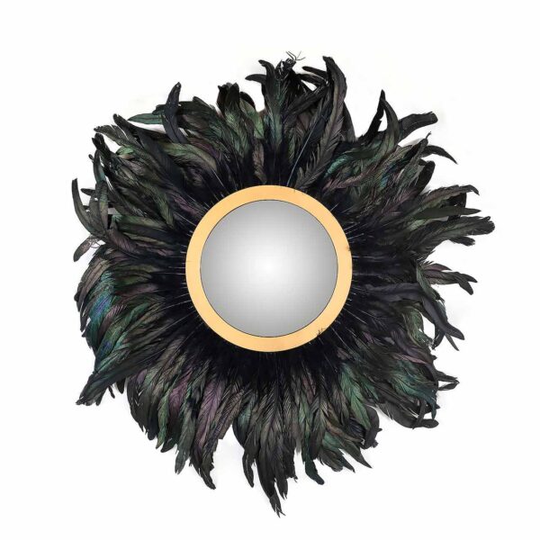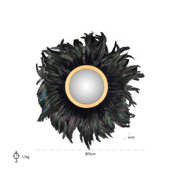 Круглое зеркало «Madlen» с позолоченной рамой из металла украшенное черными перьями. Диаметр 75 см.